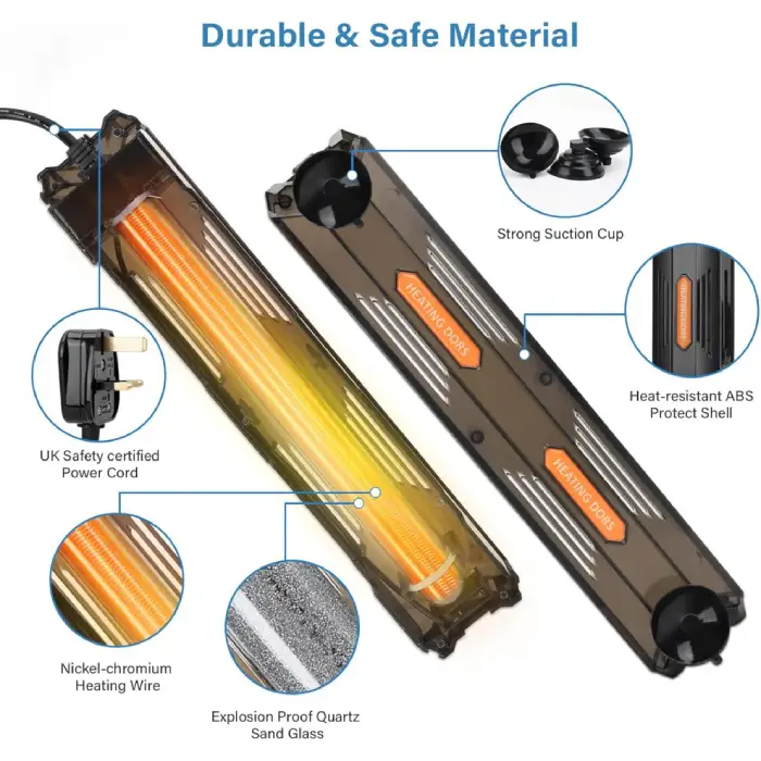 • Explosion-proof Quartz Glass Heater: This quartz heater is made of thickened high-temperature resistant quartz glass material and explosion-proof quartz sand, which has a good sealing performance to prevent water from entering, making it a more fish-friendly heater. The heater guard is made of high-quality PC plastic to protect aquarium inhabitants from hurt.