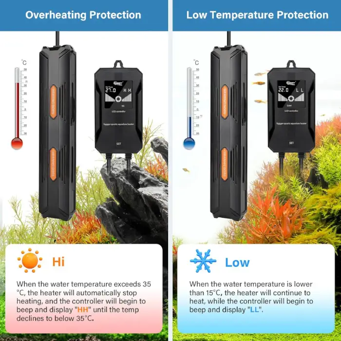 • Wide Range of Use: The hygger heater is suitable for 113L to 984L tanks. It can be used in fish markets, fish tanks, aquariums, fishponds, and other places where aquatic life is kept.