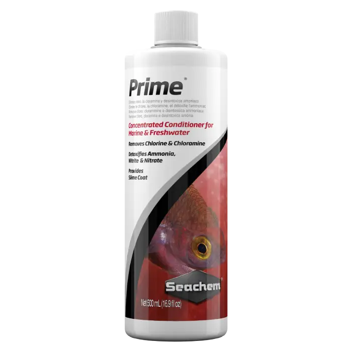 Seachem Prime 500ml—concentrated water conditioner for aquariums. Removes chlorine, chloramine, ammonia, and detoxifies nitrite/nitrate for healthy fish!